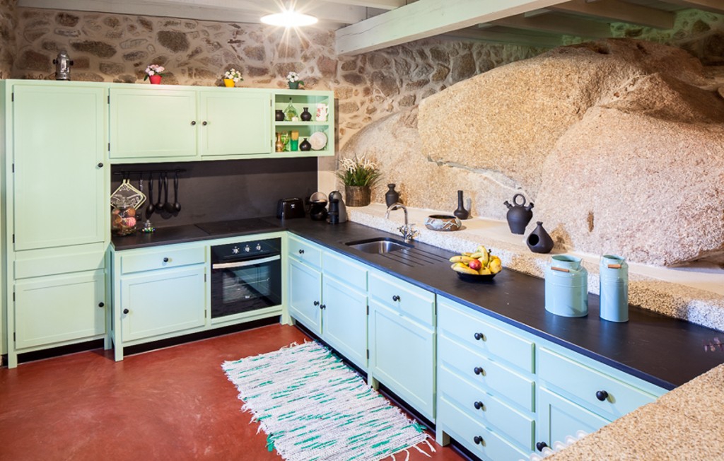 A cozinha, situada no piso térreo, encontra se decorada com um penedo granítico por trás da bancada, tornando o espaço invulgar.